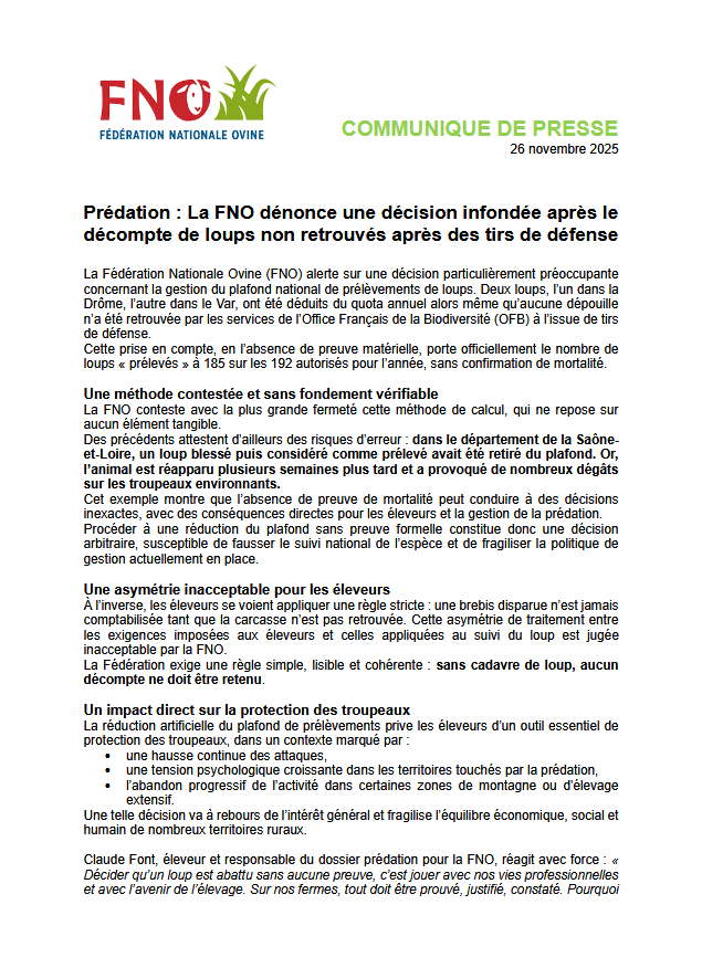 Dans un communiqué du 26 novembre, la FNO (éleveurs d’ovins, FNSEA) conteste le fait que des loups ciblés lors de tirs mais dont le cadavre n’a pas été retrouvé soient…
